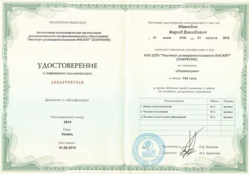 • 2018 - Повышение квалификации: Ростовский государственный медицинский университет (психиатрия);